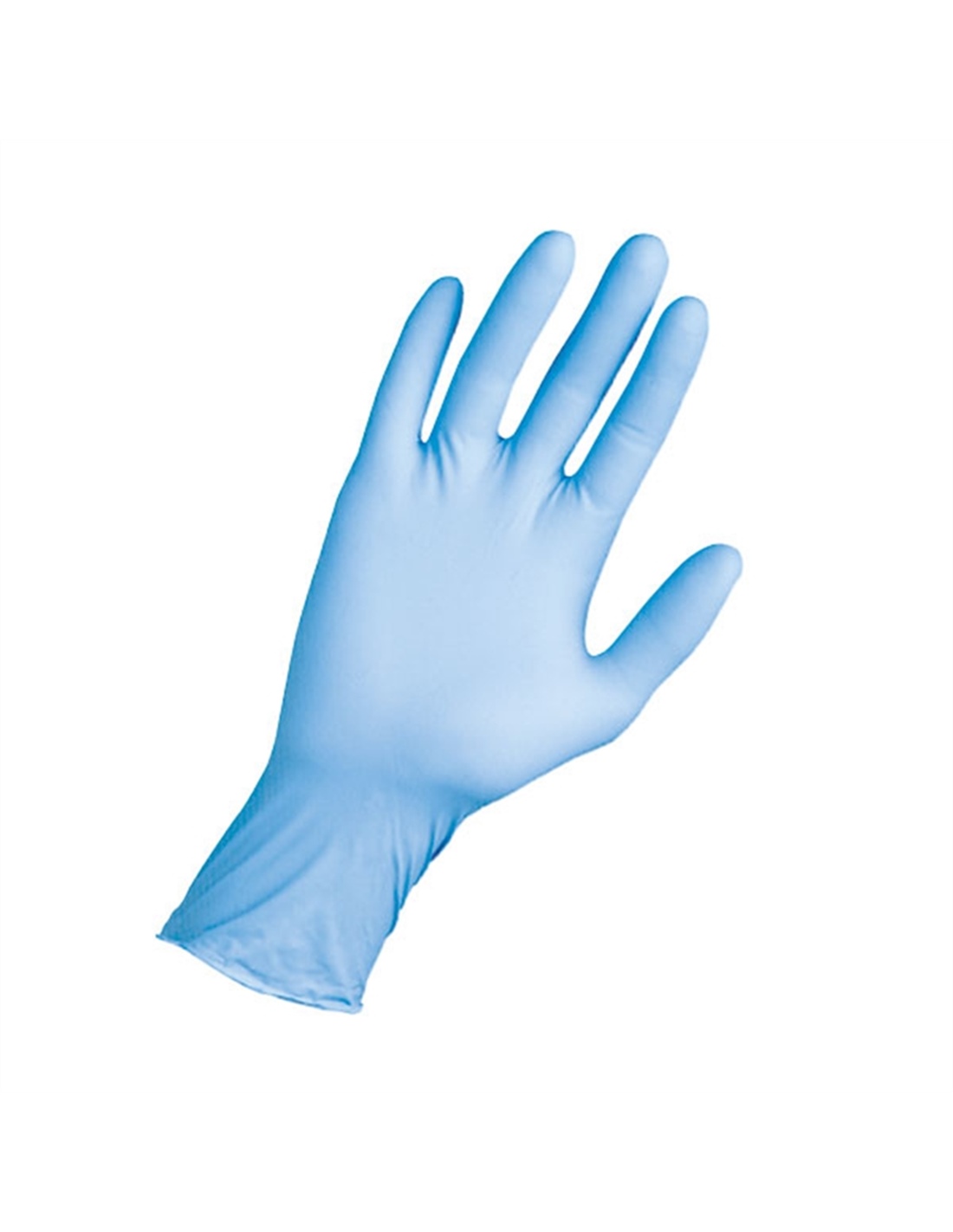 • Guanto monouso SINTETICO IN NITRILE colore blu-azzurro, ambidestro con bordino senza polvere.